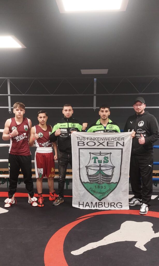 Neues von der Boxabteilung vom TuS Finkenwerder. Mit neuen Wettkampfanzügen im Gepäck fuhren die Boxer zu einem Turnier. Die jungen Athleten landeten punktreiche Treffer. Aber reichte es am Ende für den Sieg? Unser ehemaliger Sportler und Finkenwerder Jung: Aziz Keskin, hat uns für unsere Kampfeinsätze neue Trikots zur Verfügung gestellt. Vielen Dank für das Sponsoring an das Sachverständigen-Büro Keskin. Die Jungs vom TuS Finkenwerder werden bestimmt mir mehr Ehrgeiz an die Kämpfe herangehen. Spätestens beim nächsten Turnier: dem Bodden-Cup 2023. Die Boxer vom TuS Finkenwerder beim Bodden-Cup Am 21. Und 22. Oktober 2023 fand der 3. Greifswalder Bodden-Cup statt. Die Boxer vom TuS Finkenwerder waren beim Boxturnier, das vom Box- und Freizeitclub Greifswald e.V. ausgerichtet wurde mit dabei. Alle Athleten trugen sehr gute Kämpfe aus. Talal Alsadoun, der in der Kategorie Jugend 54 kg startete, machte den besten Kampf des Tages und bezwang seinen Gegner klar nach Punkten. Eduart Boreiko Jugend 80 kg hatte seine Schwierigkeiten aber konnte sich am Ende gegen seinen Gegner durchsetzen und entschied das Wettkampfsparring im Ring für sich. Alkan Hançer und Yann Deloze mussten sich knapp geschlagen geben. „Auswärts zu gewinnen ist immer sehr schwierig. Aber die Jungs haben sehr gute Kämpfe geboten und darauf kann man aufbauen.“, so Trainer Mecit Cetinkaya. Text von Mecit Cetinkaya