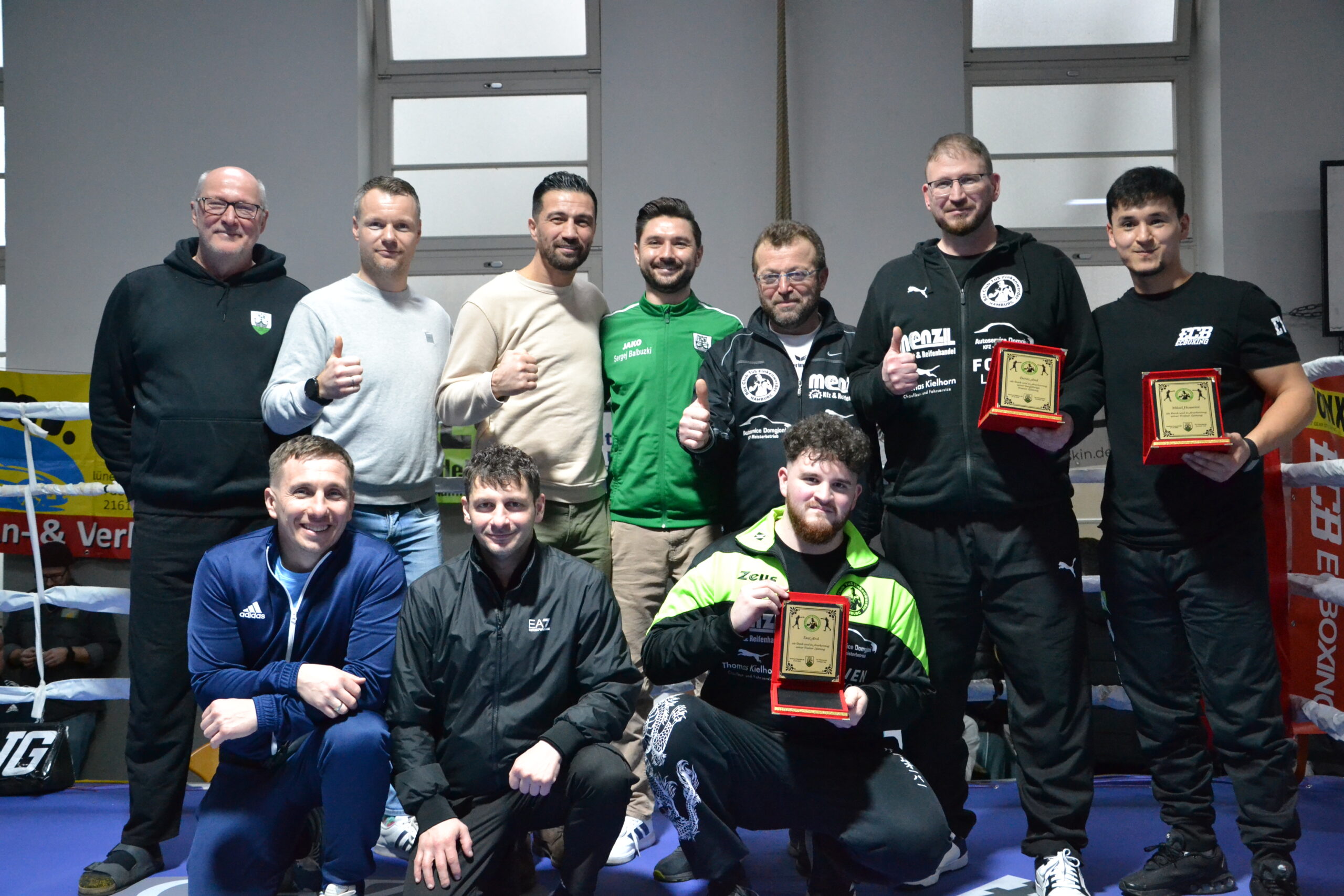 Mecit nutzte eine Pause, um seinen Trainern als Dank und in Anerkennung der langjährigen Trainerleistung eine Ehrung zu überreichen. Aufgrund des Engagements von Deniz Anil, Milad Hosseini und Esat Anil für diese Abteilung haben sie sich diese auf jeden Fall verdient. Die beiden ehemaligen Vorsitzenden des TuS Finkenwerder Sergej Balbuzki und Thomas Kielhorn (auch Unterstützer der Veranstaltung) kamen mit auf die „Bühne“ gratulierten den Dreien.