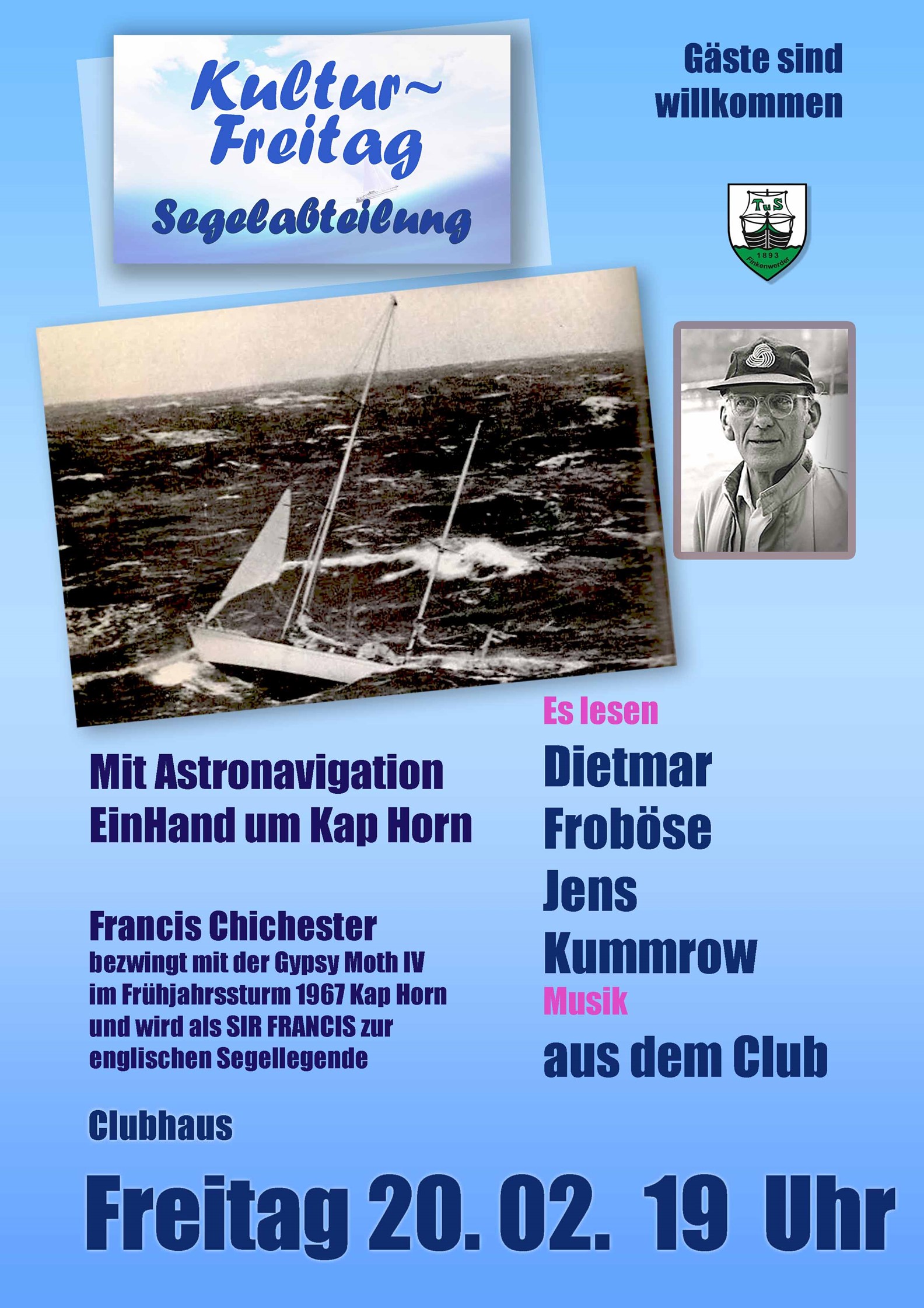 Basierend auf seinem Logbuch lässt Francis Chichester uns freimütig die dramatischen Tage der Kap- Umrundung im Frühjahrssturm 1967 miterleben. Aus seinem Buch Held der 7 Meere liest Dietmar. Jens wird Interessantes zur Vorgeschichte und Details zu der für diese Reise konstruierten 16 m Ketch, der Gypsy Moth IV, vortragen.
