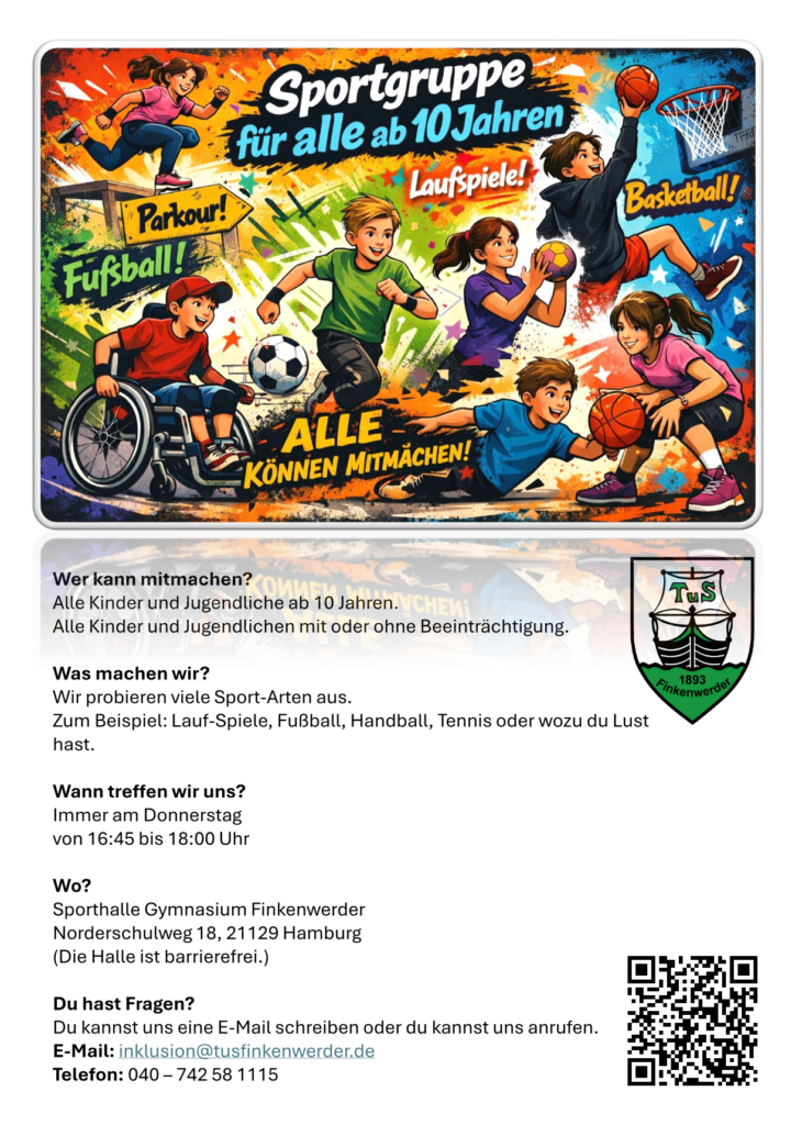 Seit diesem Jahr haben wir eine inklusive Sport-Gruppe. Das bedeutet: Sport für alle ab 10 Jahren. Wir probieren viele Sport-Arten aus.